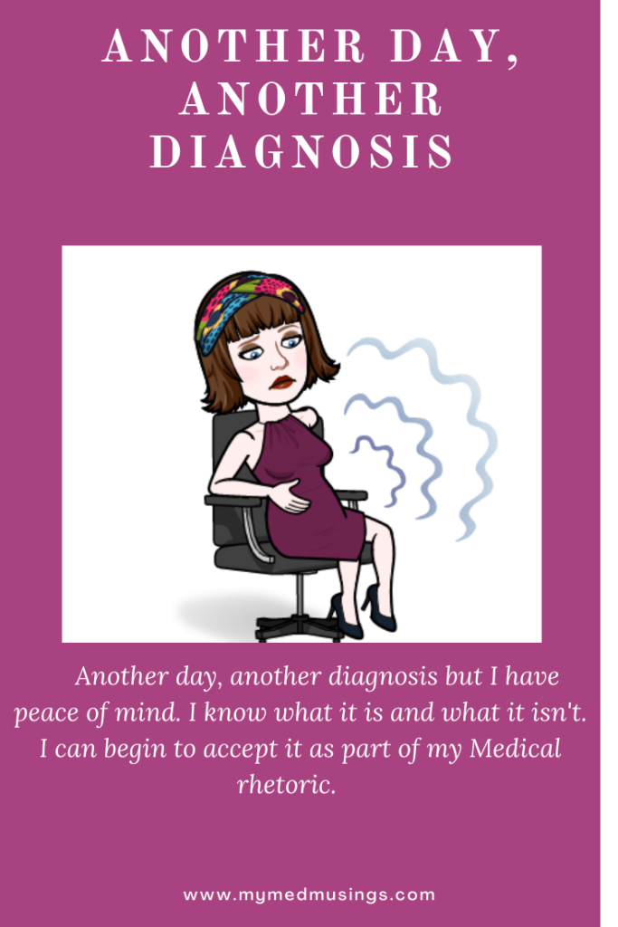 Another day, another diagnosis but I have peace of mind. I know what it is and what it isn’t. I can begin to accept it as part of my Medical rhetoric.