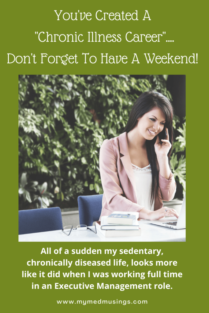 If you are feeling overwhelmed with your own workload, created by your new “chronic illness career”, I hope I’ve encouraged you to acknowledge you are actually working and you do need to have time off each week…..just like you would if you were employed in the “abled” workforce.