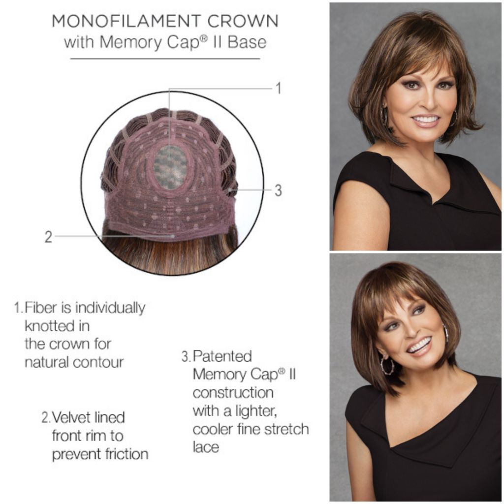 I’m learning “wig jargon” with terms like, monofilament crowns with memory caps etc. In the picture below, the “tech” details of my chosen wig are explained and you can see what its like underneath. It’s a Raquel Welch brand wig (modelled by the lovely lady herself).