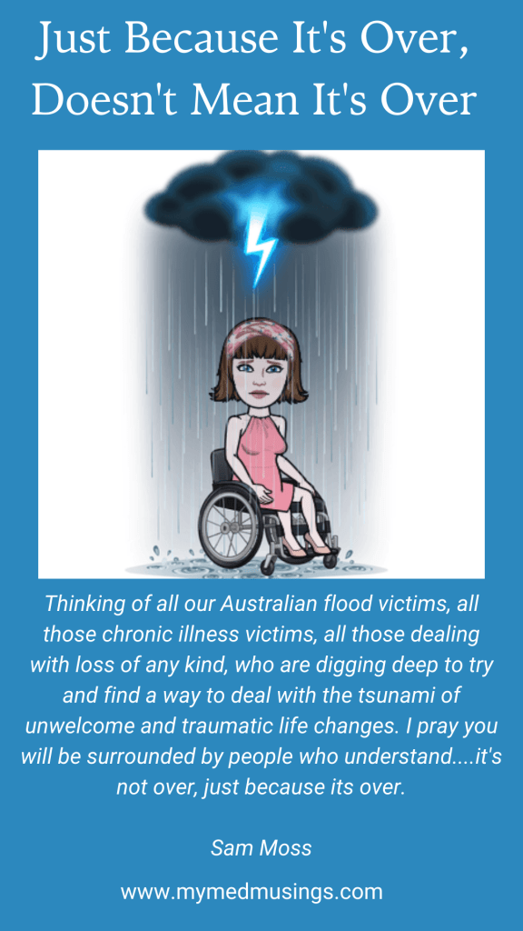 Thinking of all our flood victims, all those chronic illness victims, all those dealing with loss of any kind, who are digging deep to try and find a way to deal with the tsunami of unwelcome and traumatic life changes. I pray you will be surrounded by people who understand….it’s not over, just because its over.