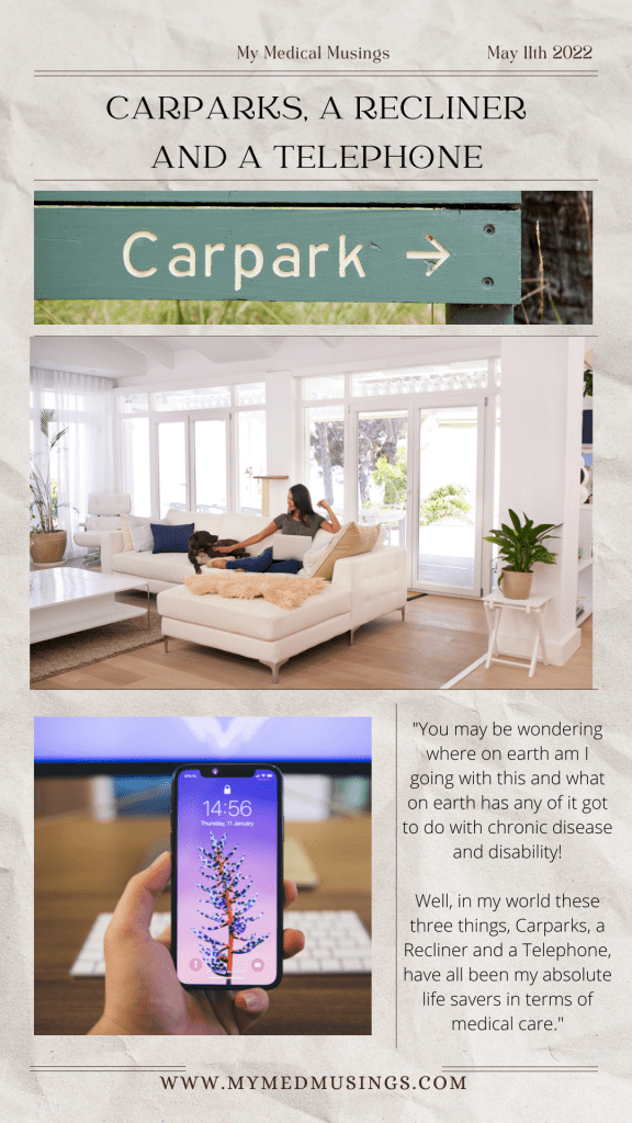 Well, in my world these three things, Carparks, a Recliner and a Telephone, have all been my absolute life savers in terms of medical care.
