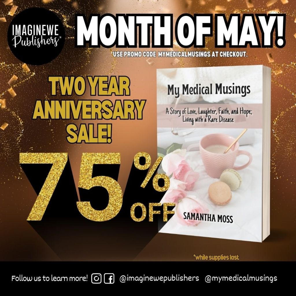 Happy Two-Year Anniversary Month to Samantha Moss of My Medical Musings! In celebration of this book, we are doing an anniversary sale for 75% off of My Medical Musings for the month of May!