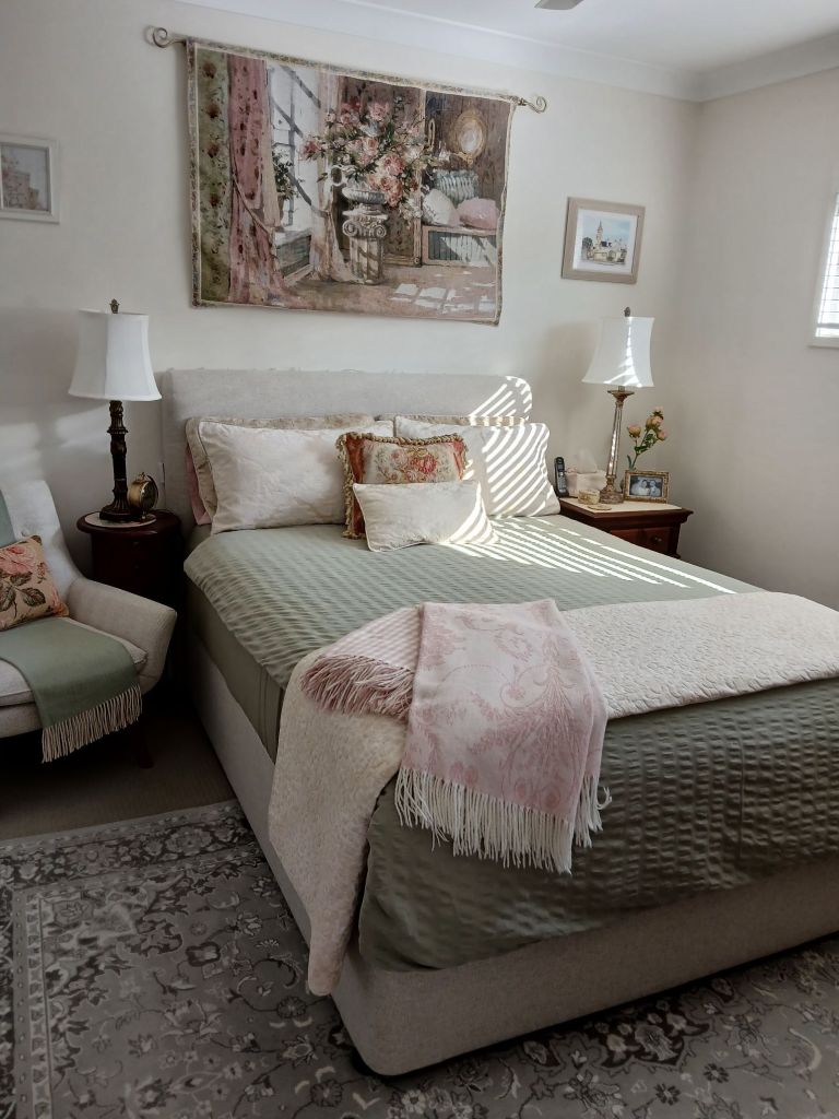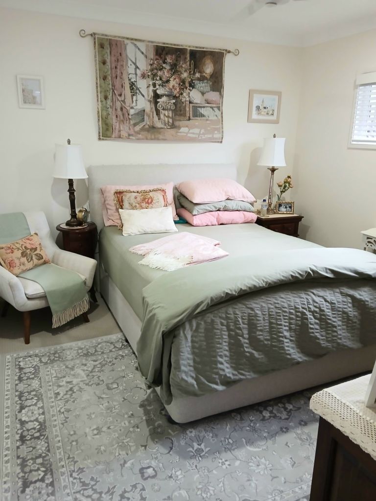 I’ve included a “full bed made” photo and the “easy bed make” photo which is basically pulling back the quilt and top sheet, adding the pretty cushion, usually found on the fully made bed, and placing a couple of throws to keep me warm (it’s winter here)
